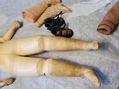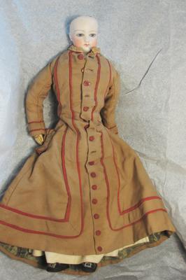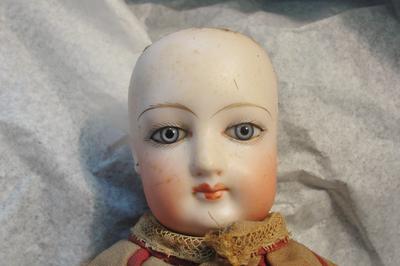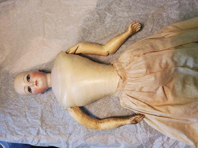 This is an old doll from my family. It is 17" , it is missing the hair. Has glass eyes, pierced ears. There is a 3 on the back of the head. It has what I believe to be original clothes. Leather body with jonted arms and legs.