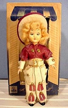 One of the most unusual AandH dolls is the Ken Murray's TV Glamour Cowgirl. She wears a very risque costume for the '50s with her chaps covering only bare legs. Waistband boasts "I Like the Wide Open Spaces."