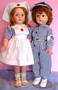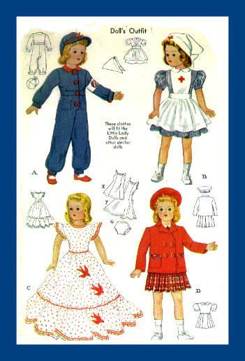 During the war years (1943) McCall's Needlework produced a pattern for the Little Lady doll which included a Red Cross Nurse uniform and a Civil Defense overall. Another was available to fashion a wedding gown, my favorite suit ......which you see worn by dolls in the R&B section, and a hostess gown.