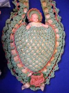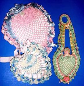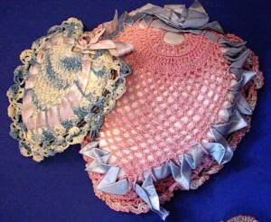 Vintage crochet heart pillows and little doll