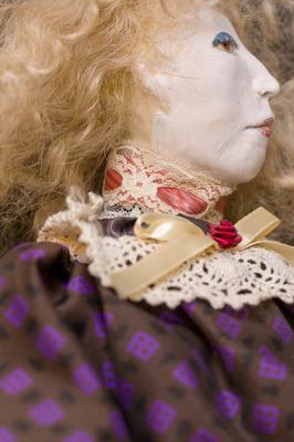 The body is stuffed with cloth and looks quite modern. The choker around the neck was closed with what looked like glue and was relatively easy to peel apart. There are no marks that I can see on the head or hands.