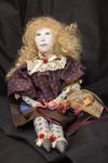 It has what appears to be a bisque head with curly human hair. It has some very thin cracks that look to be a result of the firing process and not due to impact damage.