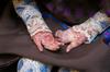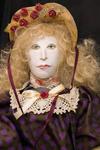 The face is adult and painted to look as if it's heavily made up with pure white makeup. The finish is matte. The hands are also bisque, much smoother finish, a relatively dark red with a golden wash/patina on the backs.