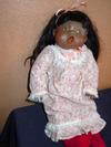 This is a dark skinned doll with a mark of 82 and some type of symbol under it. 13 1/2" tall. In a nightgown. Mouth open in a yawning position.