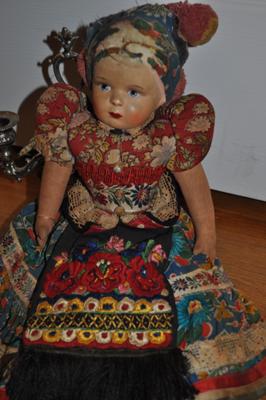 I don't know much about this doll except that she may have been purchased overseas, and is at least 60-75 yrs old. She appears to be composition, with jointed harms and legs made of cloth. No identifiable markings, but has original costume.