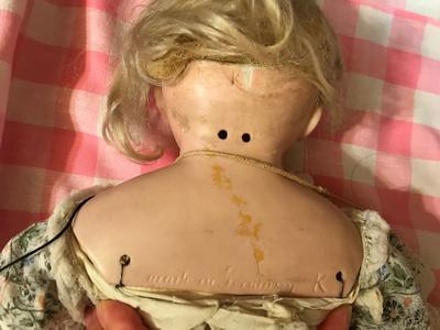 In addition to the markings in the 3 photos provided, One had a marking of "HANDWERCK". The small doll with braids has a circle, with a plus sign in it, on the back of the head, and the number 13 on her back.