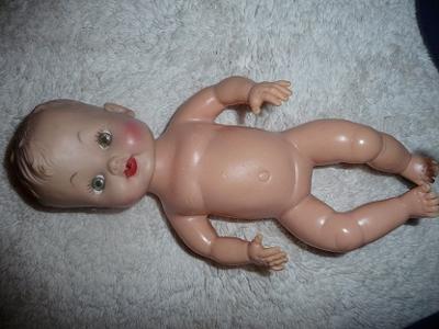 I have looked for this doll but can't find one that looks just like it. It is about 11 inches long has a hole in her mouth and a hole in her bottom, there is also a hole in her upper back with metal around it. None of her limbs move but her head does.