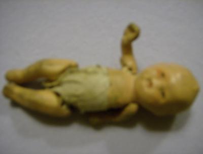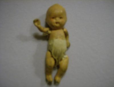 I have a 3 inch doll baby. String joints and diaper is glued on. On back of diaper is "made in japan" and neck of baby "Japan". Has little swirl of hair made into head of doll. Spuinty eyes and flat ears. Very small mouth.