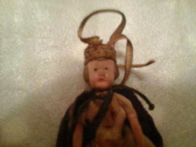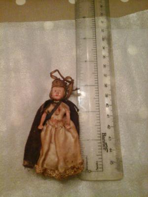 She's 3" tall with molded hair (looks like she could have been intended as some kind of bauble judging by the ribbons on her hat).
