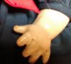 She has no markings. The hair and clothes were replaced. Her head, arms, and legs move. The surface of the skin is crackled in many parts. I am not sure if she's plaster. Her eyelids open and close. One eye still has upper lashes. Both eyes have lower lashes painted on her face. Her lips are red and almost heart-shapede. There is a painted red "blush" mark on her elbows. I can see her belly button.