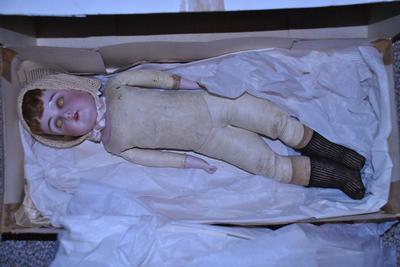 Head to toe = 18" Sawdust stuffing Sleeping eyes. Sewn-in joints in body Bisque arms / hands Mouth open w/ teeth