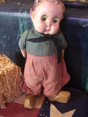 His body is made of cloth and his legs are stuffed with straw. His shoes are wooden clogs and his eyes are googly. His clothes are felt.