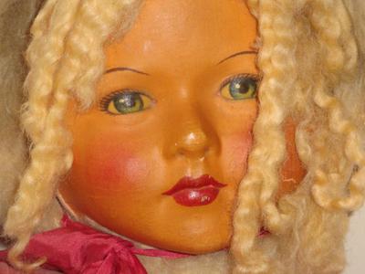 She was stuffed with a material like wood or straw.Blue eyes and her "skin" on her face is almost like a hardened painted fabric
