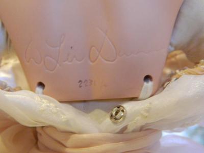 I think she is 18". Has wonderfully kept clothing. There is a signature on her back that appears to say W Len(r)Dunn with a number 2231 A...