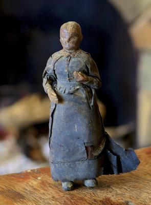 It is about 7 inches tall, hand carved, the arms lift slightly and the doll is dressed in a very papery thin black fabric. The body and head are of one piece of wood the the two feet are nailed to the bottom of the torso.